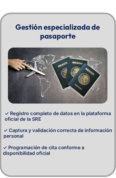 Desde el registro correcto, la revisión minuciosa de tus datos y documentos, hasta la programación estratégica de tu cita, cuidamos cada detalle para que tu trámite sea rápido, claro y sin errores